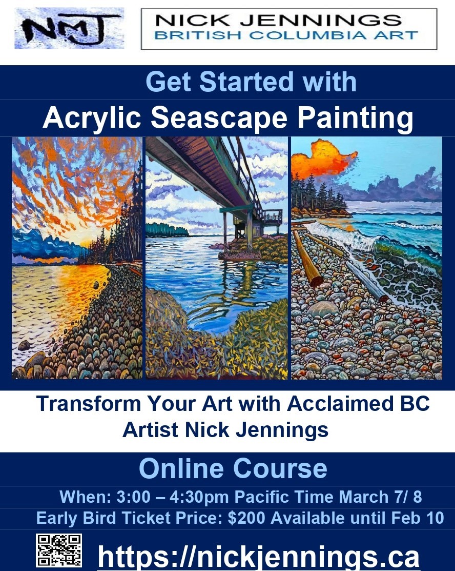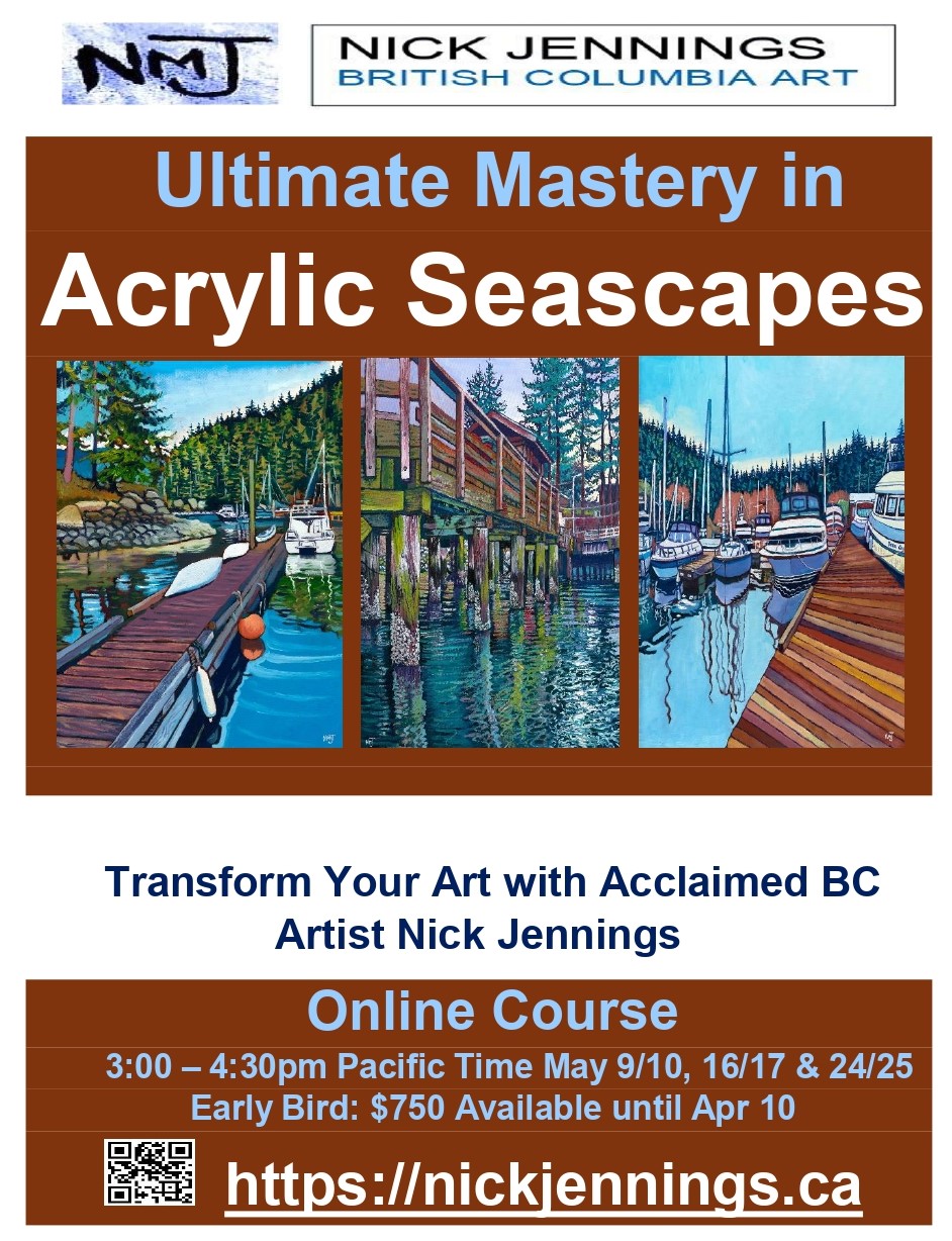 This course comprises six 90-minute classes spread over three weekends. This course builds on the knowledge and experience gained on the first two courses and ties everything together to establish your overall expertise at painting beautiful seascapes that are rich in personal expression and detail. Among the areas covered are: how to paint horizons, how to paint sky including clouds and sunsets, how to paint ocean detail, waves, water patterns and reflections, how to paint trees, seagulls, cliffs, boats and docks. and how to build colour and detail into existing elements.