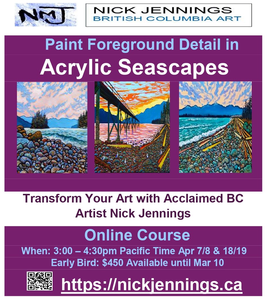This course comprises four 90-minute classes spread over two weekends. Foreground detail is where the eyes go when people view your art, so let’s get skilled at it! You will learn how to paint rocks, driftwood, barnacles, frayed rope, rusty chains and seaweed. You will also develop your own personal approaches to detail, colour mixing and light patterns in relation to these foreground details. You will come away with true confidence, competency and enthusiasm for creating mesmeric shoreline detail.